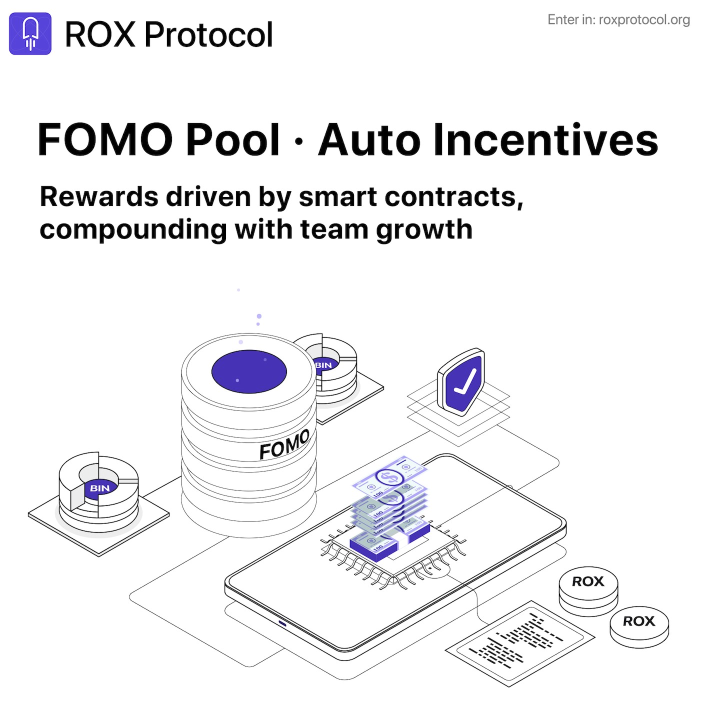 ROX Protocol 是一个“全新的去中心化自动做市协议”。其核心模式十分简洁:“通过双币做市引擎简单质押 USDT 即可获得复利收益,USDT 进 USDT 出”。