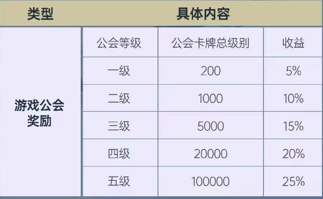 每一张卡牌都对应着不同的战斗力,团队总卡牌战斗力达成一定的值,个人可获得公会等级,从而享受整个团队材料产出的5-25%奖励。